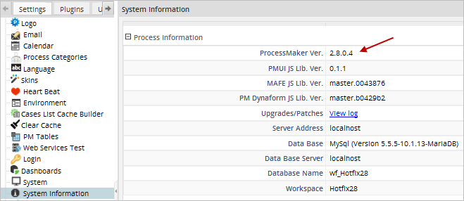 Once finished, log in to ProcessMaker and open the Admin tab, then go to System Information under Settings to see if ProcessMaker has been upgraded. The ProcessMaker version number should now include the number of the Hotfix / Patch installed.