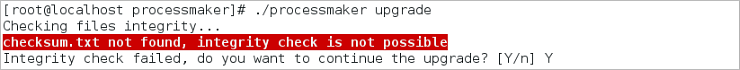 If the integrity check fails, the process will ask the user if he/she wants to continue with the upgrade process. Answer "Y" to continue.