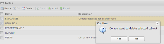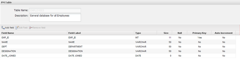 PM tables are designed for users who do not wish to go through the hassle of maintaining an external database. Even users who have external databases may find PM tables handy for managing data that will be used in Dynaforms or Output Documents. The data in PM tables is stored in the MySQL database wf_<workspace> (which by default is named wf_workflow), so the data can also be accessed by an external program.