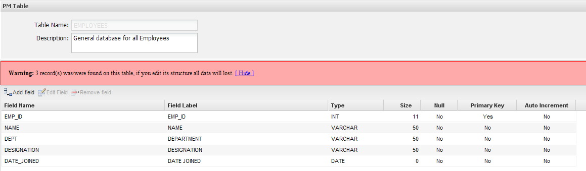 Fields can be added, edited and removed. Take into account that if the structure of the table is edited all data will be lost.