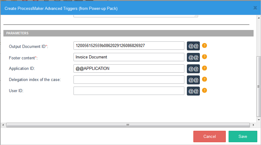 2. Create the trigger. Go to TRIGGERS, then click on the WIZARD button. Expand ProcessMaker Advanced Triggers, click on the PMFGeneratePdf (Generate PDF output document) function, and fill in the following information: