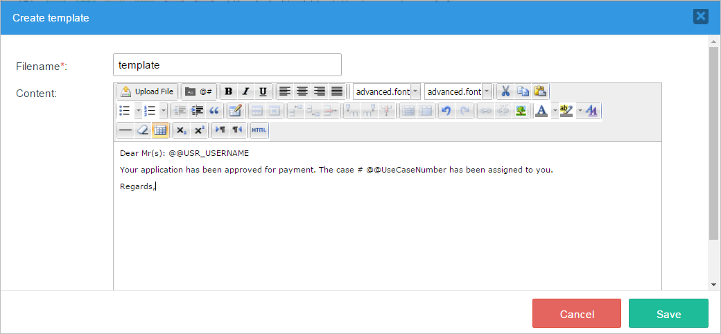 3. Then create an email template named template.html which uses the @@UseCaseNumber variable: