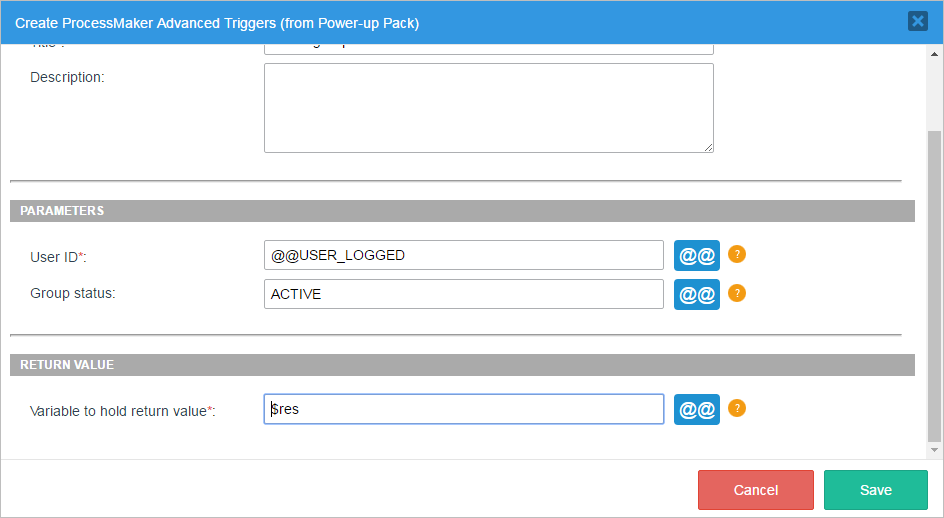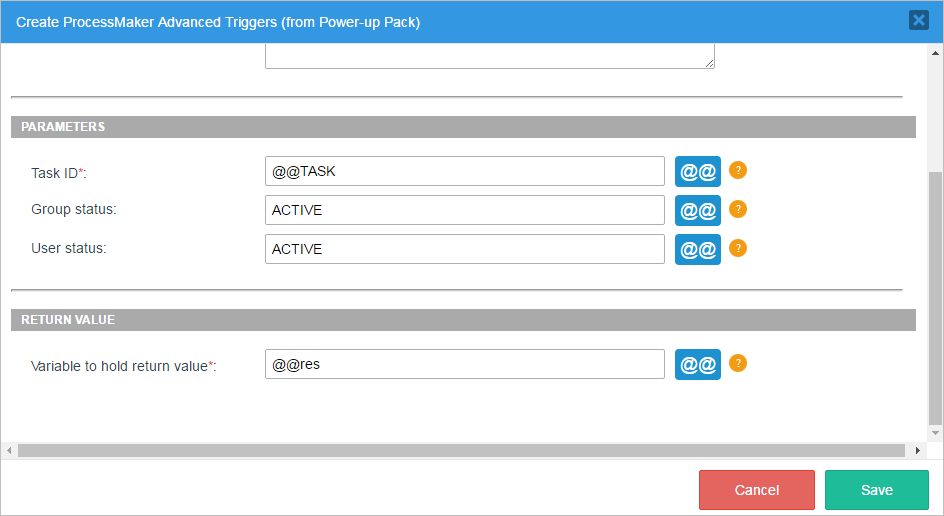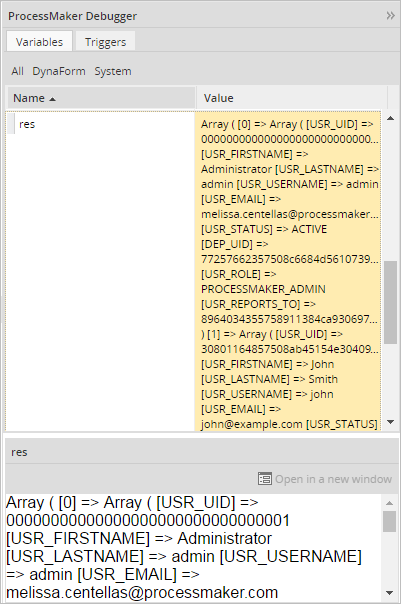 In the case of the example, the task ID will be defined inside the trigger, in our case it is @@TASK, the current task. We will get the information in the @@res variable. For this example, we use Active Groups and Users. In order to get the result you need to enable your debug mode.