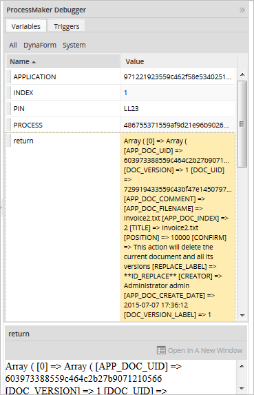 This trigger can be set to fire at any point in a process, since the fields in a Dynaform will not change. If the debugger is enabled, then the contents of the @?result can be seen when running a case: