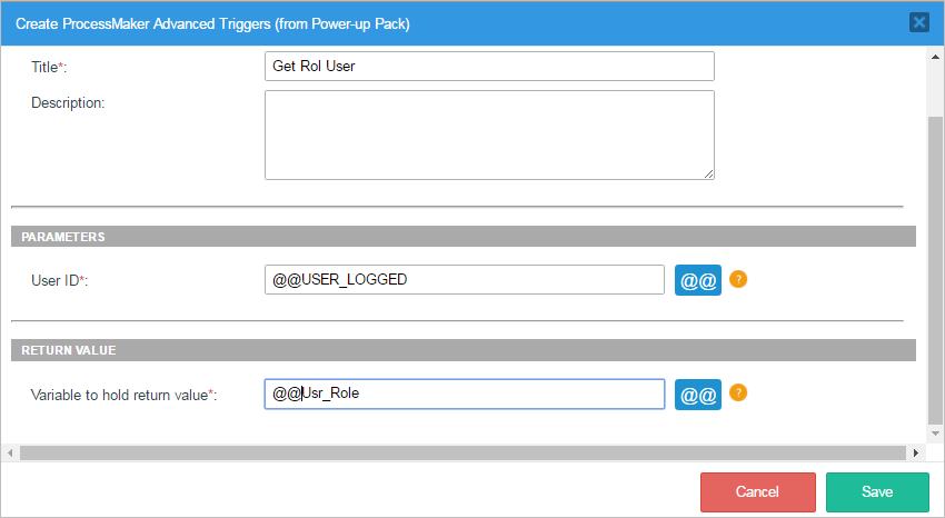 This example obtains the role a user belongs to. Create a Dynaform with a text field named "Usr_Role". Then, create the trigger with the corresponding function, so go to the TRIGGERS tab, then click on the WIZARD button. Expand ProcessMaker Advanced Triggers, click on the PMFGetRolUser (Obtain the role of a user) function and fill in the following information: