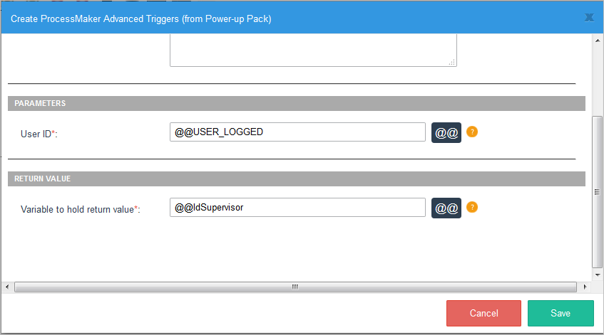 Then, create the trigger with the corresponding function, go to TRIGGERS inside the process you are working on, then click on the WIZARD button. Select ProcessMaker Advanced Triggers, look for the PMFGetUserReportsTo (Returns the user's supervisor) function and fill it with the following information: