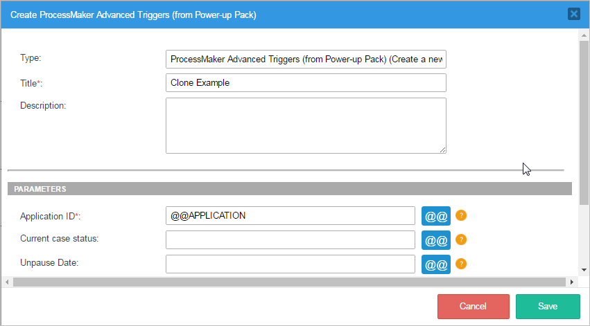 • string appUid: The unique ID of the case to be cloned. To clone the current case, use the system variable @@APPLICATION.