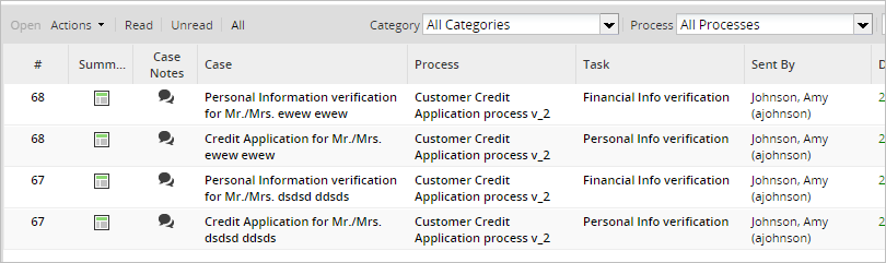 Finally, logging in as 'Amy Johnson', we will see all reassigned cases in her inbox folder: