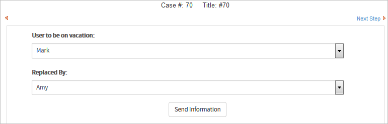 Then, execute a case. In the first field choose Mark Peterson, since he will be the person on vacation and will be replaced by Amy Johnson. This last user must be chosen on the second field: