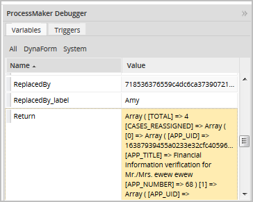 Click on the Submit button, and if you have the debugger enabled, inside the return variable you will see the number of reassigned cases and their corresponding information: