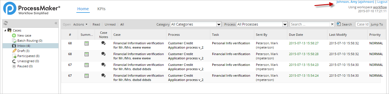 Step 3: Make sure you have pending cases for the users you are going to use. We will use two users, Amy Johnson and Mark Peterson. Logging in with Mark Peterson and going to his inbox, we will see 4 cases: