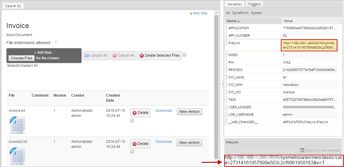 In this example, the trigger searches for the last file uploaded to the Input Document with the ID '729919433559c43bf47e145079742369'. It cycles through all the files and looks for the one with the largest APP_DOC_INDEX. Then, it creates a complete URL to download that file, which is stored in the variable @@FileLink.