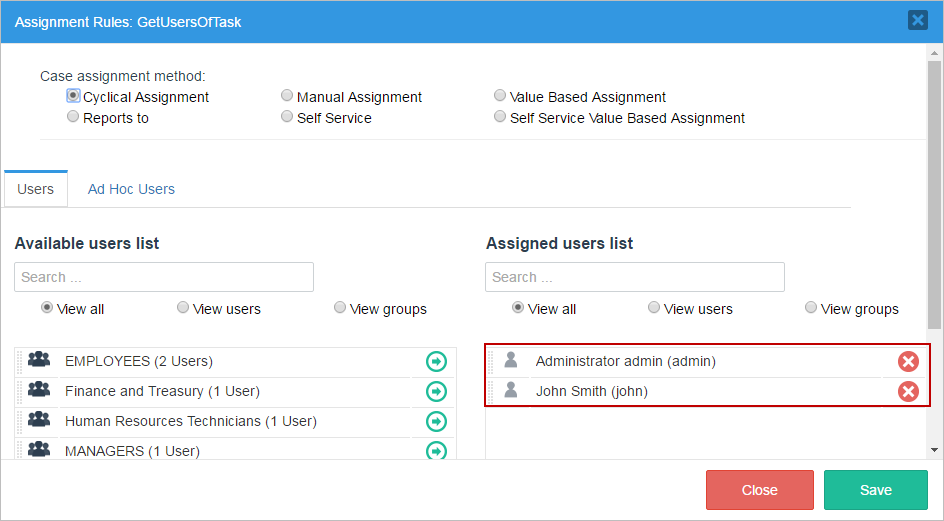 As it can be seen, the information of all users assigned to a task is displayed. This information can help to decide which user will get the next task when using value based assignment.