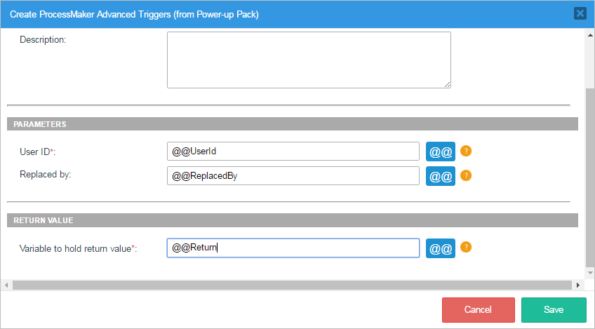 Step 2: Create the trigger with the corresponding function, go to TRIGGERS inside the process you are working on, then click on the WIZARD button. Expand ProcessMaker Advanced Triggers, look for the PMFSetOnVacation (Change a user to ' on vacation' status) function and fill it with the following information: