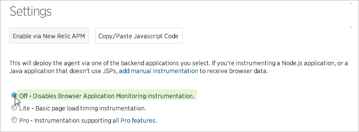 Finally, check the Off - Disables Browser Application Monitoring Instrumentation option to disable it. Click on the Save application settings button at the end of the page to save the changes.