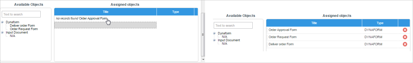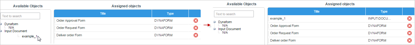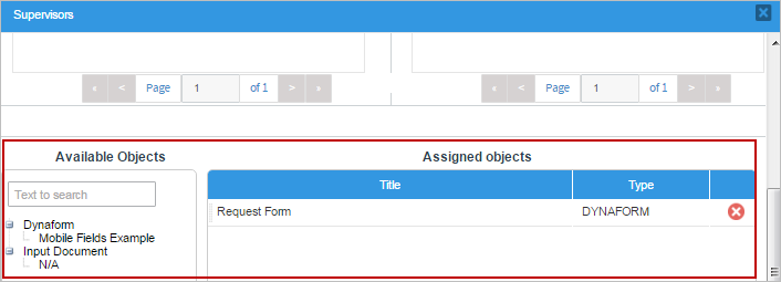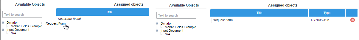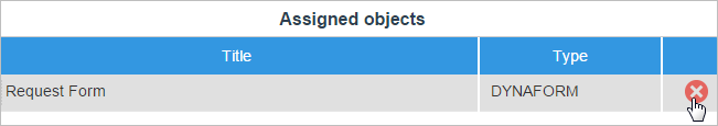 - Assigned Objects: Lists the already assigned DynaForms and Input Documents. To remove them from the list, simply click on the red x button and the object will be erased from the Assigned objects panel and will be available in the Available Objects panel.