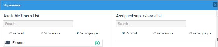 To add a new supervisor, select a user who has the PM_SUPERVISOR permission, click on the green arrow or drag and drop a user/group from the "Available Users List" to the "Assigned Supervisors list" Any number of supervisors needed can be added to this process. The same procedure goes for adding a group. Click on the "View Groups" checkbox to see all groups and add a group as supervisor.