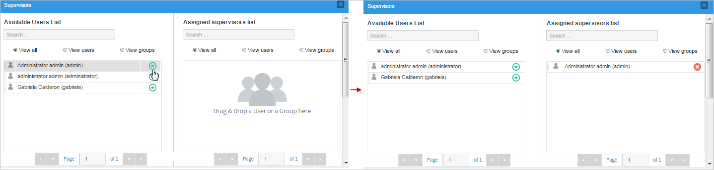 - Assign(->) For the first panel: Hover the mouse pointer over the name of the available users and groups and this button will be shown. Click on it to assign the user or group as process supervisor.