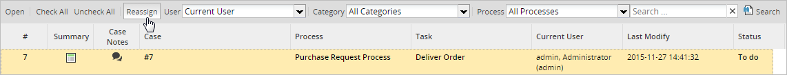 As a process supervisor, it is possible to reassign cases of other processes with the PM_REASSIGNCASE permission. Take into consideration that Paused Cases cannot be reassigned. To reassign paused cases, go to Home > Process Supervisor > Reassign.