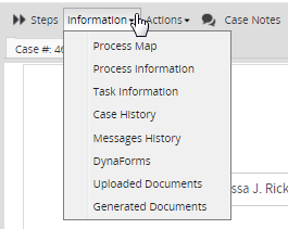 - Information: lists all information a supervisor can check, like the status of the process map, the process information, the task information, the case history, the messages history, DynaForms, uploaded and generated documents.