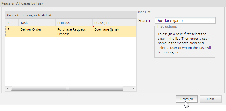 Click on the user Doe, Jane (jane) and she will appear in the case under the Reassign column as seen in the image below.