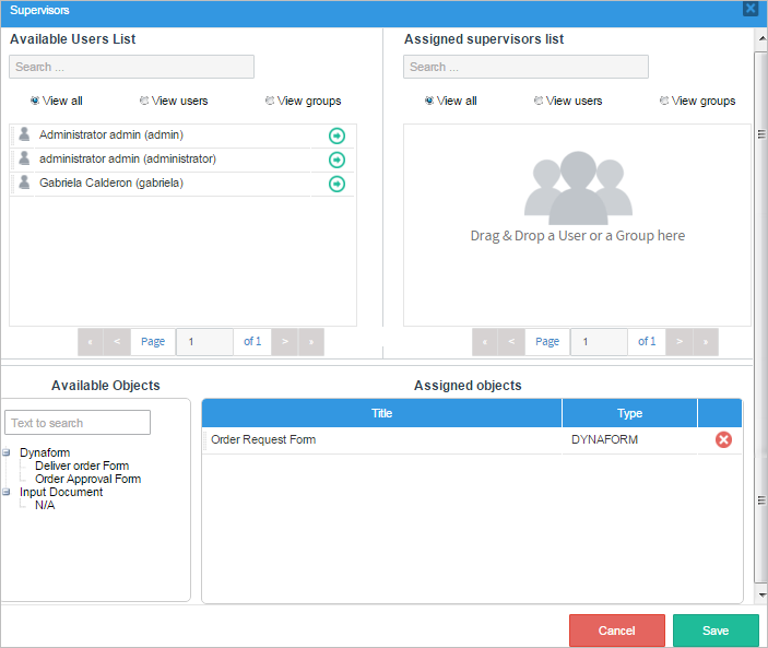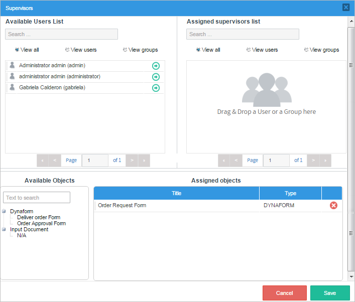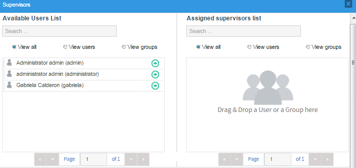 To remove a group or user already assigned as supervisor, click on the x icon at the right side of the name of the user or group, or simply drag and drop the user/group back to the Available users list.