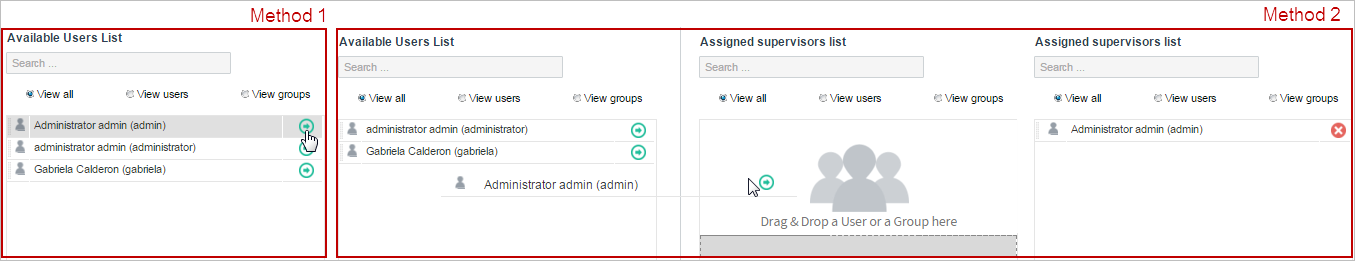 There are two methods that can be used to assign a supervisor to a process. Click on the -> green arrow or simply drag and drop the name of the user or group to the Assigned supervisor list.