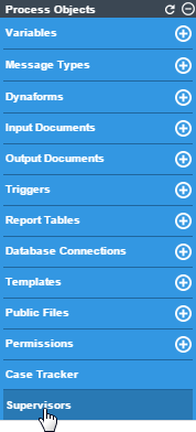 To add a new supervisor to a process, locate the "Supervisors" option in the Main Toolbox. When "Supervisors" is clicked a new window will open to configure the users and objects.