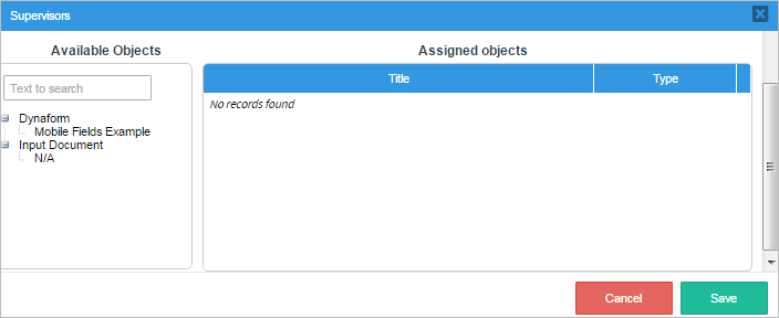 - DynaForm / Input Document: Lists all the available DynaForms and Input Documents that exist in the process to be assigned to the process supervisor. Gives supervisors the ability to work in any of them by dragging the name of the DynaForm / Input Document and dropping it in the Assigned objects panel.