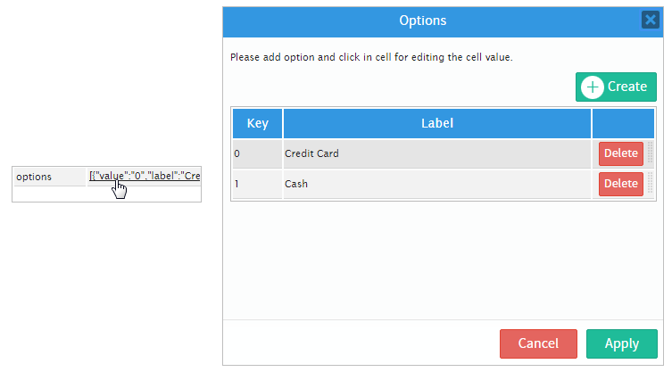 | Options | Define in this property the options that will be used to define the value used in the field. For a textbox control the value stored in the field will be the first value set in the options. Please, take a look at this documentation to learn more about the values retrieved from the options. |