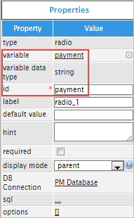 | DB Connection | For a radio control, if needing to store a value retrieved from a database, select from the dropdown of this property the database connection that will be used (the connection must be already created in the process, check this section to learn more about it). |