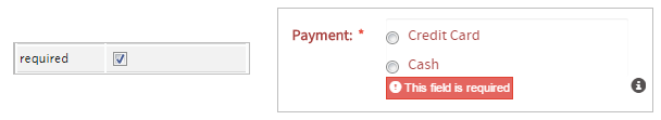 The "required" property adds an asterisk in the label to indicate that the field is required and that an option must be selected. If trying to submit the form the field will immediately change to a red color and as seen in the image below if nothing is selected then an error message will be shown.