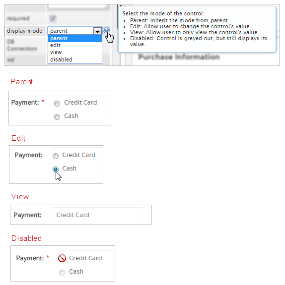 The next property is the "display mode" property which has many different options, to know more about them hover the mouse pointer over the question mark icon, this property will have the following effect on the control:
