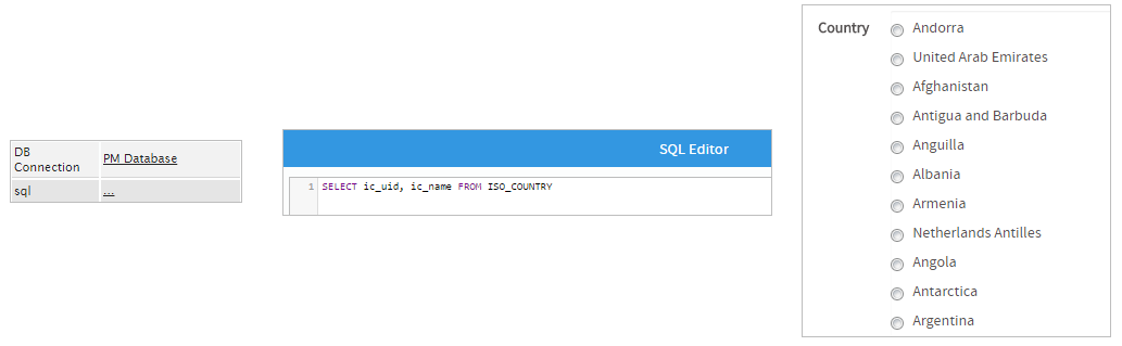 The "DB Connection" property is used to select between the list of database connections defined in the process objects in this case a PM_Database (a database of ProcessMaker). The "sql" property uses a query to call values from the database. For the use of a sql query the example will be changed. The name of the control will now be "country" so the query will populate the control with the countries in a table ISO_COUNTRY. Click on the underlined ellipsis ... of the "sql" property to open an "SQL Editor" and add the following code: