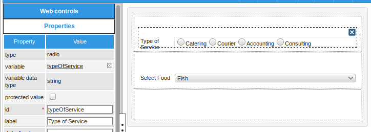 When adding this control to the designer, the options created in the configuration of the variable will be shown. If the options of the radio (group) must be retrieved from a SQL query, these will not be shown in the designer. The properties related to this web control are the following: