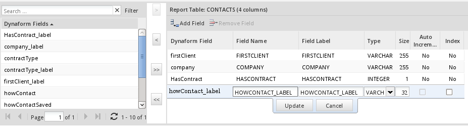 If a new field is added to a master Dynaform, or its field name is changed, the definition of the Report Table will not automatically update to include the new/changed field. The definition of the Report Table will have to be manually updated to include the new/changed field.