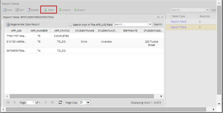 The information entered into Dynaform fields and case variables are stored as serialized strings, which are not easy to access with database queries. Report Tables are designed to put case data into a format that can be easily accessed by standard SQL queries or external applications. Report Tables also allows case data to be easily queried in Dynaform fields and to be shared with external reporting tools such as Crystal Reports, Jasper Reports and Pentaho Reporting.