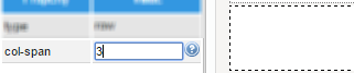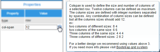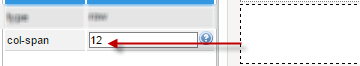 The span set in this property must be inserted manually per each column added. Remember that the maximum number to be set in this property is 12 which means there will be only one column in the row which occupies 100% of it. To add columns to the row, set the span they will take in the row. For example, if the row will have two columns, set the span the column at the left will occupy: