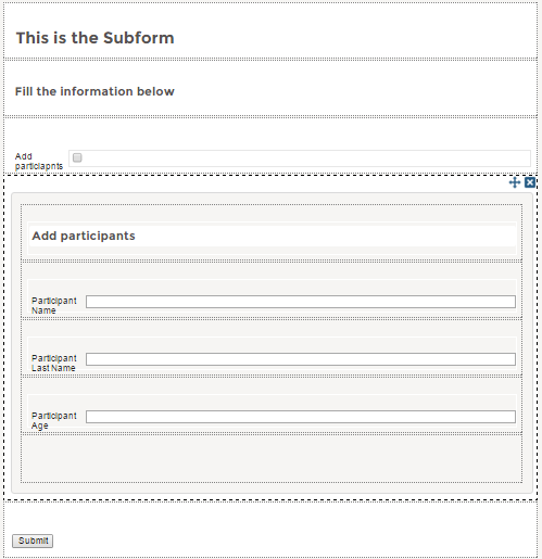 A Subform control inserts a Dynaform that was already created in the project into a master Dynaform, adding it as another row of the design and displaying its entire design when running a case. To add this control to the Dynaform, drag the following icon from the left panel and drop it into the designer.