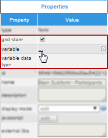 Once the properties are displayed, the only property that can be changed is the grid store property. When this property is checked, a variable can be added by clicking on the underlined ellipsis .... A new window will be shown.
