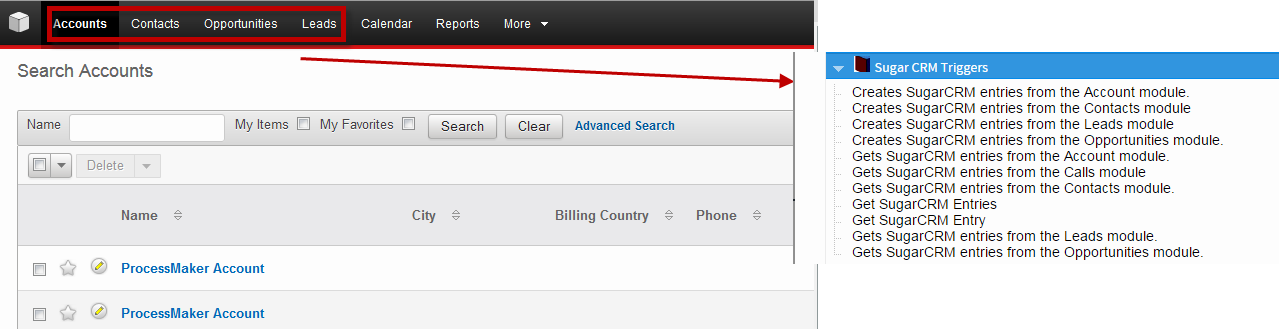 In the image below, you can see the option to create SugarCRM triggers from ProcessMaker (For example create an account), which affects directly to the SugarCRM Environment.