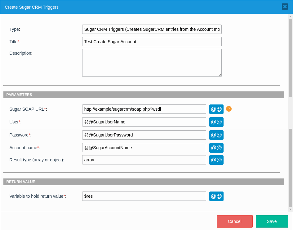 $res = CreateSugarAccount("http://example/sugarcrm/soap.php?wsdl", @@SugarUserName, @@SugarUserPassword, @@SugarAccountName, "array");