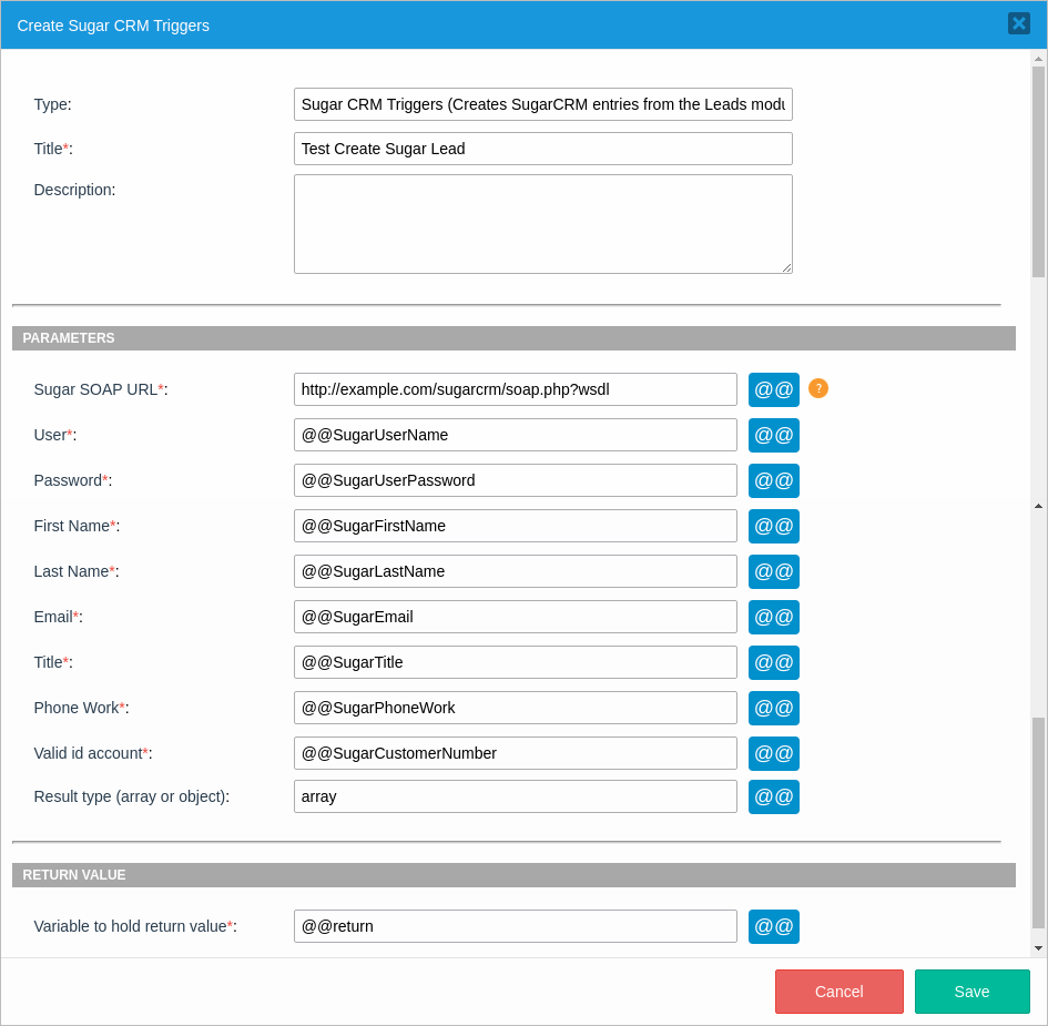 @@return = CreateSugarLeads("http://example.com/sugarcrm/soap.php?wsdl", @@SugarUserName, @@SugarUserPassword, @@SugarFirstName, @@SugarLastName, @@SugarEmail, @@SugarTitle, @@SugarPhoneWork, @@SugarCustomerNumber, "array");