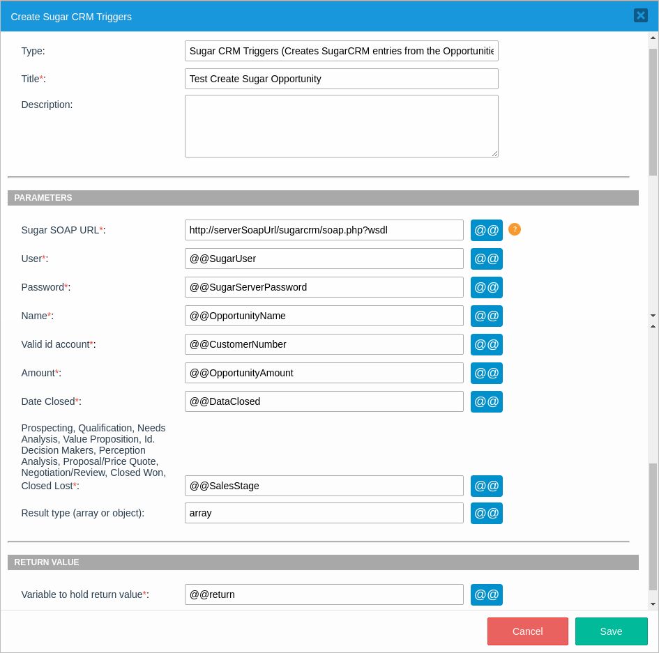 @@return = CreateSugarOpportunity("http://serverSoapUrl/sugarcrm/soap.php?wsdl", @@SugarUser, @@SugarServerPassword, @@OpportunityName, @@CustomerNumber, @@OpportunityAmount, @@DataClosed, @@SalesStage, "array");