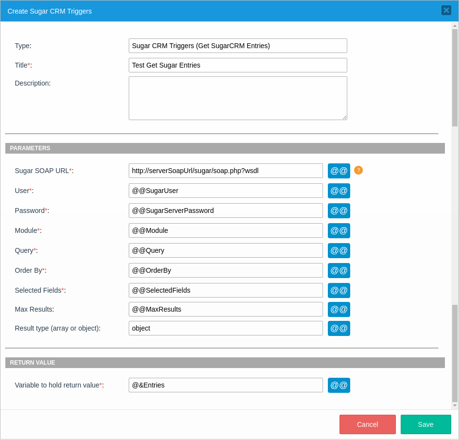 @&Entries = GetSugarEntries("http://serverSoapUrl/sugar/soap.php?wsdl", @@SugarUser, @@SugarServerPassword, @@Module, @@Query, @@OrderBy, @@SelectedFields, @@MaxResults, "object");