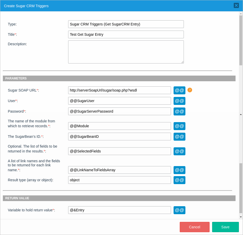 @&Entry = GetSugarEntry("http://serverSoapUrl/sugar/soap.php?wsdl", @@SugarUser, @@SugarServerPassword, @@Module, @@SugarBeanID, @@SelectedFields, @@LinkNameToFieldsArray, "object");