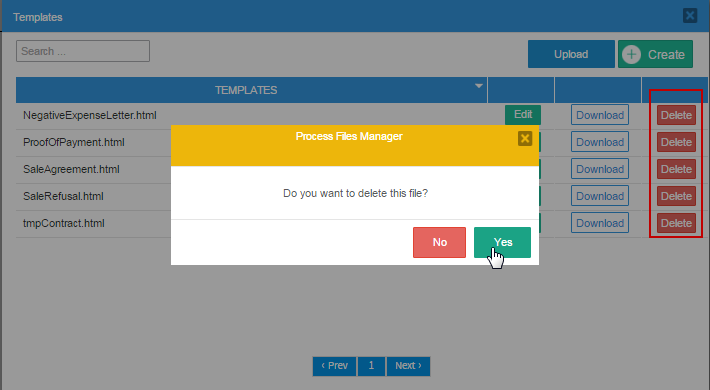 7. Delete: Click on this button to delete the template. A message box opens to ask if the template should be deleted. Click on NO to close the message box and return to the Template list without deleting the template. Click on Yes to delete the template and a flash message will be shown at the top part of the process map confirming the elimination of the template.