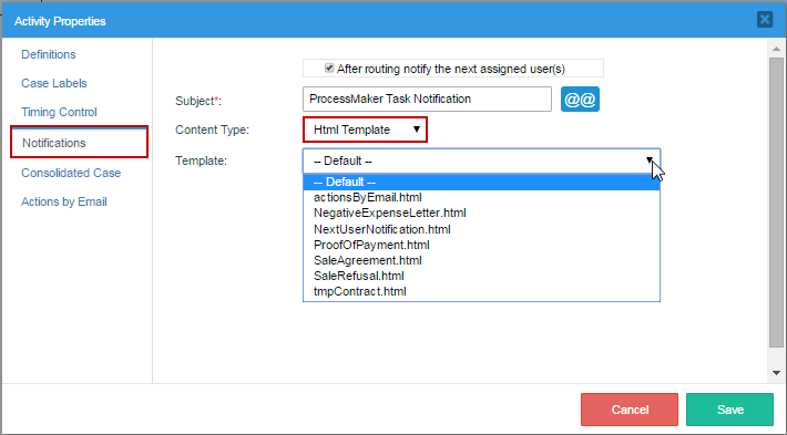 • Actions By Email (for the Enterprise Edition): Templates are used by Actions by Email in the Enterprise Edition, which allows users to receive an email in which they can send information to ProcessMaker cases and also route those cases onto the next task in the process.