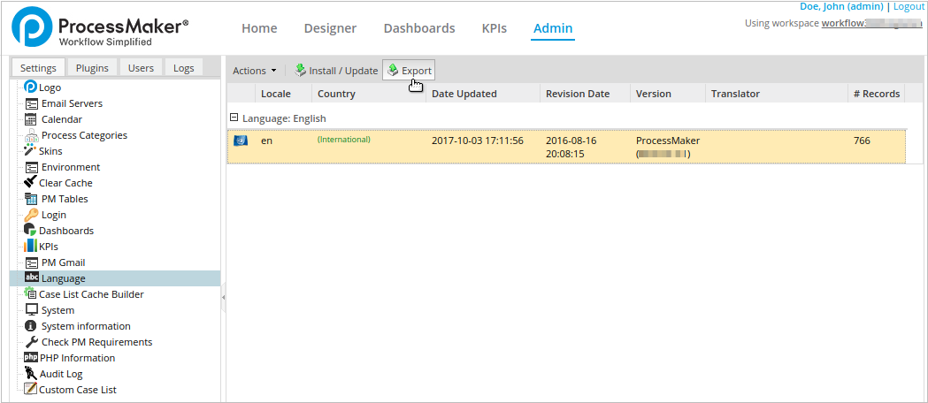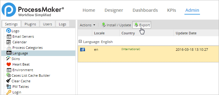 1. Download the version of the English translation file for your installation of ProcessMaker. The English file must be used to as a reference to create or update another translation since the English file contains all the correct and updated labels. You can download it once ProcessMaker is installed by going either to Admin >Settings >Language, choosing the English file and clicking on Export, or from the ProcessMaker SourceForge page.