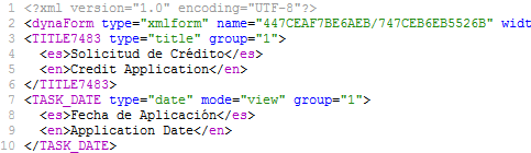 Then, go to the XML of the Dynaform, and make sure that the label is enclosed inside the <en> </en> tags, which means it is using the English label.